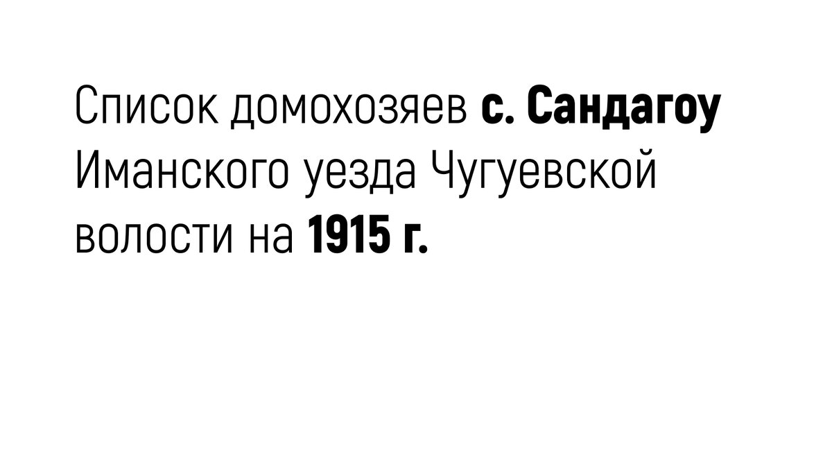 Ниже привожу список домохозяев села Сандагоу Иманского уезда Чугуевской волости от 14 сентября 1915 г. с указанием ФИО главы семьи, года водворения на участок*. *в документе также указан численный состав семьи (количество детей до 5 лет, количество женщин и мужчин от 17 до 55 лет, и количество остальных членов семьи), только цифры. В некоторых случаях указано примечание. При необходимости я пришлю вам информацию. Напишите @kabanovaev в телеграмм или на почту kabanova6644@gmail.com Агарков Иван Ларионович 1907
