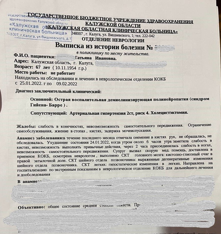 На одной из главных улиц Калуги стоит многоэтажный дом, здесь живут 71-летний Геннадий Николаевич и 70-летняя Татьяна Ивановна. У мужа вторая группа инвалидности, по зрению, а у Татьяны Ивановны - первая, чуть больше двух лет назад она узнала о своем редком диагнозе – синдроме Гийена – Барре.