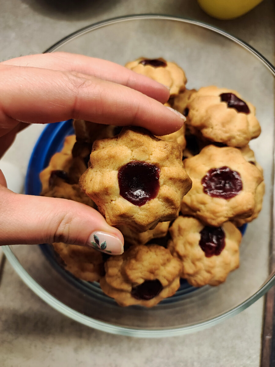 Бакинское курабье — это традиционное азербайджанское печенье, известное своим нежным, песочным вкусом и уникальной текстурой. Это одно из самых популярных и любимых лакомств в Азербайджане, которое часто подают в праздничные и торжественные дни. Ингредиенты: Приготовление: Сливочное масло комнатной температуры взбиваем миксером с сахарной пудрой до получения пышной массы. Добавляем яйцо, соль и разрыхлитель, затем продолжаем взбивать еще немного. Постепенно добавляем муку и, по желанию, ванильный экстракт. Тщательно перемешиваем, затем перекладываем в кондитерский мешок. Для формирования печенья идеально использовать насадку "французская звезда", однако можно использовать любую подходящую насадку из вашего арсенала. Формируем печеньки небольшого размера и влажным пальцем делаем углубление посередине для начинки. Начинку можно выбирать любую: от варенья до орехов и прочего. Я предпочла использовать ягодное варенье. Выпекаем при 190 градусах около 10 минут. Вот столько печенья из данног
