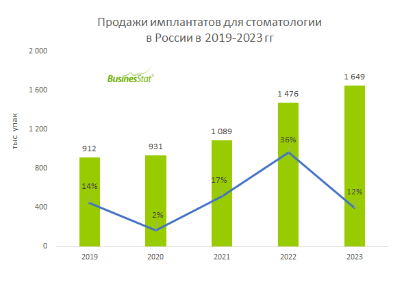 По данным «Анализа рынка имплантатов для стоматологии в России», подготовленного BusinesStat в 2024 г, за 2019-2023 гг продажи стоматологических имплантатов в России выросли на 81%: с 0,9 до 1,6 млн упаковок. Российский рынок зубных имплантов находится на стадии активного роста и развития. Большое количество людей в стране нуждаются в замене потерянных зубов и выбирают имплантаты как наиболее эффективный и долговечный способ восстановления зубного ряда. Профессиональный рост стоматологов и доступность обучающих программ содействуют расширению круга специалистов, предлагающих имплантацию. Рекордный рост продаж дентальных имплантатов произошел в 2022 г (+36%) из-за повышенного спроса на изделия в условиях предполагаемого дефицита и ожидаемого увеличения стоимости как на сами импланты, так и на услуги по их установке. Полный обзор рынка на РБК: https://marketing.rbc.ru/research/38843/ Полный обзор рынка на нашем сайте: https://businesstat.ru/catalog/id80953/