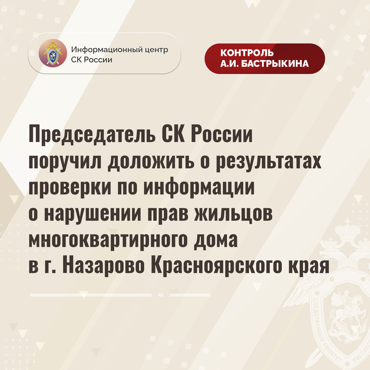 Председатель СК России поручил доложить о результатах проверки по информации о нарушении прав жильцов многоквартирного дома в г. Назарово Красноярского края
