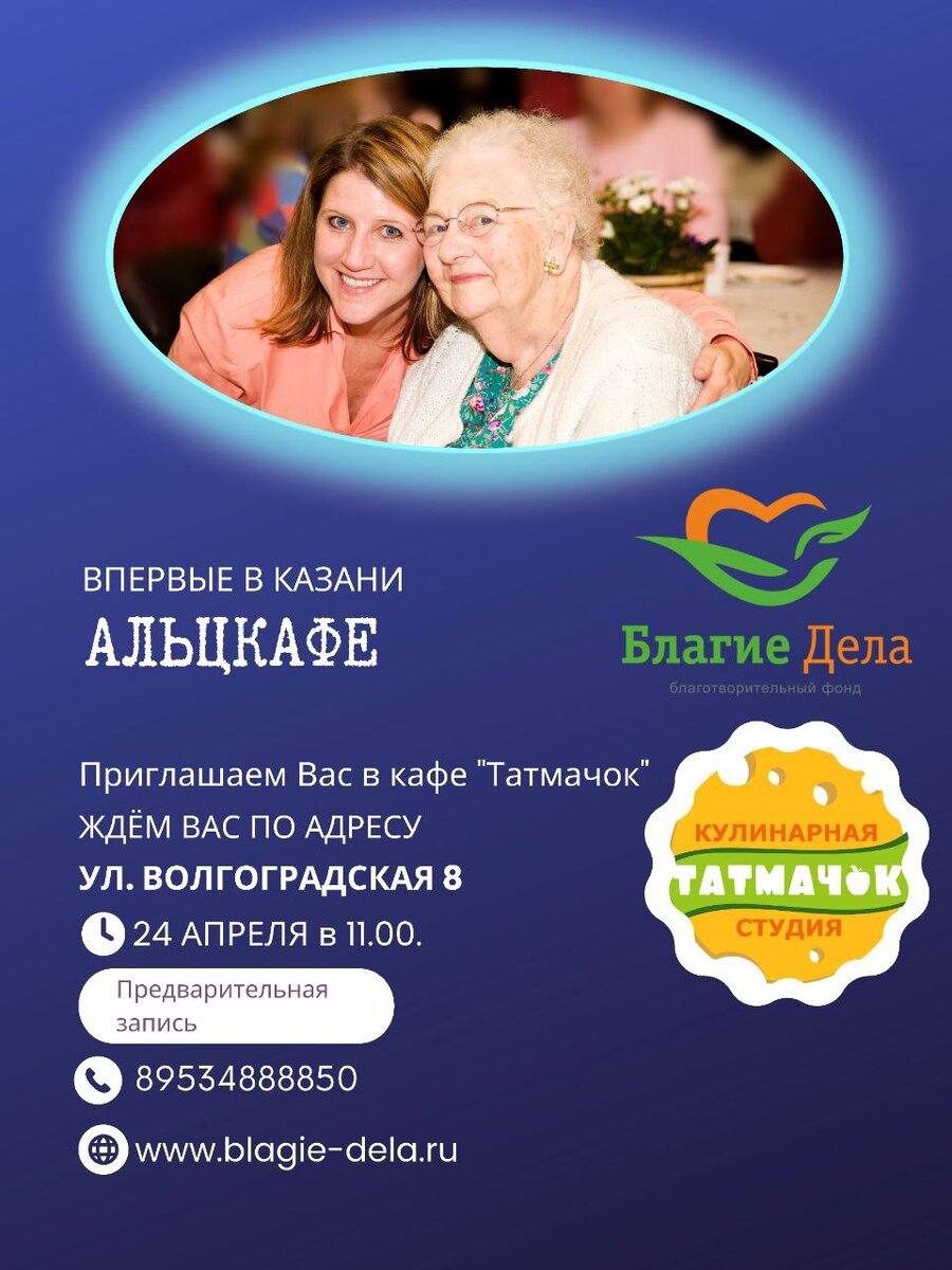 24 апреля в 11.00 ч. при поддержке Благотворительного фонда «Благие Дела» в кафе «Татмачок» по адресу ул. Волгоградская 8, (2 этаж) состоится мероприятие «Альцкафе». Приглашаются пожилые люди с синдромом деменция, в сопровождении ухаживающих родственников. Целью является оказание поддержки через праздничное мероприятие, создание ощущения радости, спокойствия и счастья. В рамках программы будут проведены мастер-классы с приготовлением синнабонов, семейное чаепитие, танцы и настольные игры. Данный формат уже 25 лет помогает семьям находить поддержку и создавать радостные моменты, проводя время вместе. Для организации комфортных условий на мероприятии, обязательна предварительная запись по телефону 8 9534 8888 50.