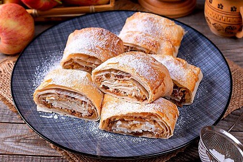 Для приготовления штруделя возьмите самые сладкие и ароматные яблоки, так как сахара в составе этого десерта нет – сладости яблок и изюма вполне достаточно.