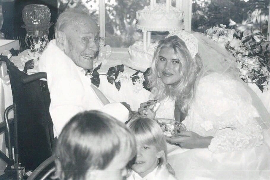 Когда я смотрю на эту фотографию, я сразу вижу любовь. Любовь молодой девушки к огромному состоянию этого престарелого джентельмена. По глазам этого престарелого джентельмена прекрасно видно, что и он знает об этой её любви. Девушку, изображенную на фотографии, зовут Анна Николь Смит. На момент свадьбы ей было 26 лет. Её 89-летнего избранника зовут Джеймс Говард Маршалл II. Он — нефтяной магнат с миллиардным состоянием. Думаю мало кто будет осуждать этого престарелого джентельмена. Провести последний год своей жизни в объятиях молодой и красивой жены, это действительно может быть очень заманчиво. Женщины, не спешите осуждать этого развратного старичка, так как в ответ на ваши осуждения, я могу привести противоположные примеры, где роли меняются, и уже богатая возрастная леди находит себе молодого парнишку-жеребца. Но давайте вернемся к нашим молодоженам. С интересом старика мы разобрались — за ласку, нежность и заботу на смертном одре можно и раскошелится. Интерес молодой девушки тоже