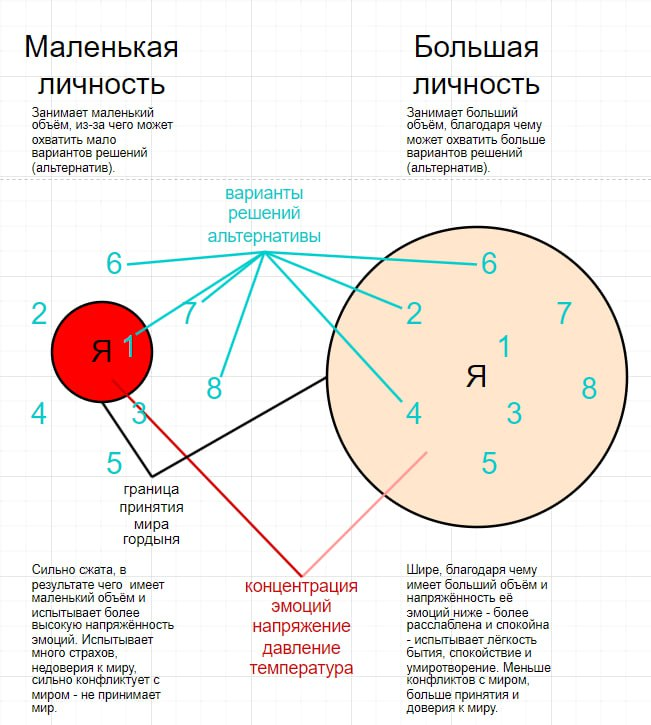 Из-за того, что маленькая личность имеет маленький объём, она покрывает меньшее пространство в пространстве вариантов, из-за этого она либо вообще не видит никаких решений, либо видит один или два варианта решения своих проблем, которые являются низкоэффективными и высокоэнергозатратными. Из-за этого маленькая личность постоянно испытывает сильный стресс и большое напряжение, она много борется с Миром, вместо того, чтобы дружить с Миром и сделать Мир своим союзником.