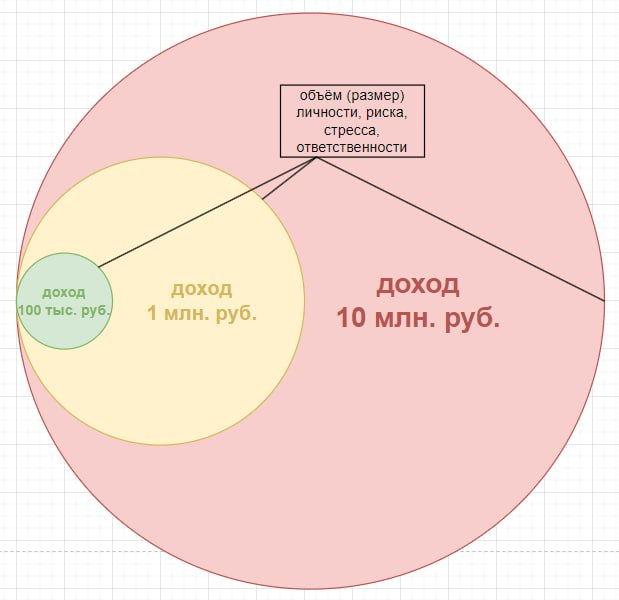 Объём (размер) личности человека определяет то, какие риски он может нести. А что такое объём риска? — это то, какую ответственность может нести человек, какой объём хаоса вокруг себя он может обработать, структурировать и упорядочить, задачи какого масштаба он может решать, какой стресс он может переваривать без ущерба для своей психики и своего здоровья. Какие риски несёт человек с доходом 100 тысяч рублей в месяц?