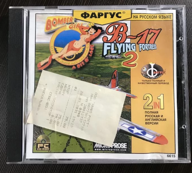 Пиратка от Фаргуса. Но, судя по новости от Игромании, Новый Диск издавал B-17 Flying Fortress The Mighty 8th в России официально На чеке сохранилась информация, что игру купили в 2001 году. Собственно и новость от Игромании датирована тем же годом. Цена пиратки - 75 рублей. В настоящее время в Стиме доступна оригинальная игра B-17 Flying Fortress The Mighty 8th 2000 года В начале этого года появился редукс __________________________________________________________________________________________ Друзья, прежде чем мы продолжим, ещё раз напомню, что вам доступны к приобретению ПЕЧАТНЫЕ журналы Сокровищница компьютерных игр. Подробности по ссылке ниже↓ __________________________________________________________________________________________ Часть летсплея которого уже можно найти на Дзене Но а инфоповод данной статьи прост - показать фото фаргусовской игры B-17 Flying Fortress The Mighty 8th с оригинальным чеком покупки в 2001 году Друзья, пост ради качественного фото артефакта.