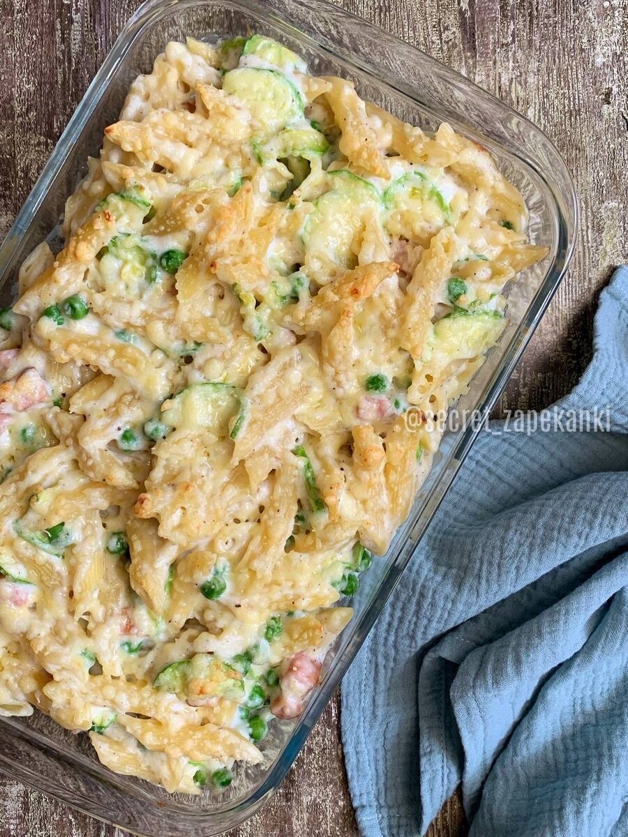 Паста – это всегда вкусно. Особенно если это паста, запечённая в соусе бешамель с рикоттой. Хрустящая корочка из пармезана, нежная обволакивающая середина, подкопчённые мясные нотки и овощи аль денте… К тому же яркие цвета всех ингредиентов делают её поистине весенне-летней. Как не соблазниться? Каждый раз готовя пасту, я понимаю, какой это огромный простор для идей и творчества. Давайте творить: - паста (пенне, фузили) 320 г - чеснок 1 зубчик - окорок, карбонад копчёно-варёный 200 г - кабачок 300-350 г - горошек с/м 200 г - соус бешамель 600 г - рикотта 200 г - пармезан 20-40 г - масло оливковое - соль, перец Форма 34*21*5 см, объёмом 2,2 л. Отвариваем пасту. Готовим соус бешамель (из половины ингредиентов). Даём немного остыть и смешиваем с рикоттой. Окорок нарезаем кубиком 1*1 см. Кабачок полукольцами. В сковороде разогреваем оливковое масло и обжариваем в нём раздавленный зубчик чеснока. Как только чеснок потемнеет, убираем его из сковороды. Нам достаточно толь