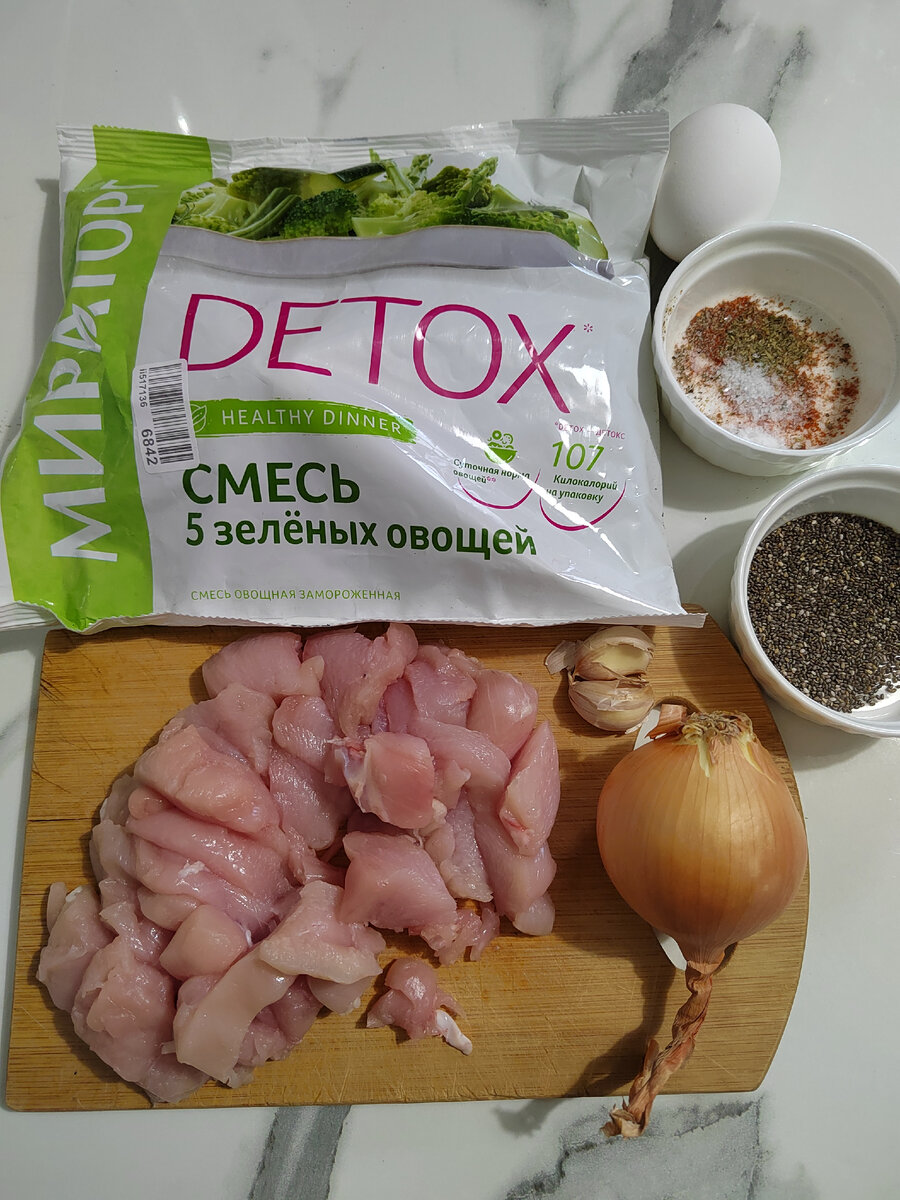 Диетический рецепт тефтелей, тушеных в смеси "5 зеленых овощей детокс" фирмы Мираторг. Сделать фарш для тефтелей, состав: 400 гр куриного филе 1 луковица 2 зубчика чеснока 1 яйцо 1 ст. ложка Чиа Различные специи, соль. Курицу, лук, чеснок пропустить через мясорубку или измельчитель, добавить ложку семян чиа, соль, специи. Перемешать, поставить в холодильник на час для набухания чиа. Замороженную смесь "5 зеленых овощей" выложить в сотейник, накрыть крышкой, тушить минут 5, открыть, перемешать, посолить, сделать в сотейнике в овощах лунки для тефтелей. Ложкой или руками сформовать тефтельки, положить их в лунки среди овощей, накрыть крышкой, тушить минут 10, открыть крышку, перевернуть тефтели, тушить еще минут 10. Тефтели, тушеные в смеси, готовы. Если хочется более поджаренные овощи и тефтели, пожарить еще минут 5 при открытой крышке. Если готовить тефтели не на ужин, а на обед, можно использовать другие готовые овощные смеси, более сытные, с крупами, например Мексиканский мик