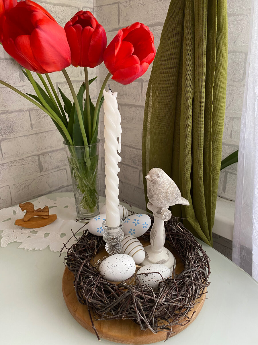 Пасха для меня - самый светлый и радостный праздник🌱 А еще он очень весенний) И не могу я отказать себе в удовольствии нарядить дом и создать праздничную атмосферу☘️ Хотелось легкого, светлого, натурального декора. Идем смотреть, что получилось?) Начну с пасхальной композиции. Основа - прошлогодний венок, который я сохранила и немного преобразила. Вытащила из него поблекшую гипсофилу, сняла подвесы и уложила горизонтально. В этом году он исполняет форму гнездышка. В центр поставила птичку, купленную в фиксе и стеклянный подсвечник с витой свечой. В качестве подноса приспособила деревянную менажницу, перевернув ее вверх дном Но главный козырь в рукаве - пасхальная гирлянда❤️ Творила ее по моей просьбе хозяйка Места для души😊 Друзья мои, у Марины руки золотые! Получилось все в точности, как я и загадывала❤️ Недаром Место для Души - и работа очень душевная😌 На всех яйцах - основах разные картинки - куличи, храмы, вербы…Рисунки деликатные, и, что важно, русские, если можно выразиться)