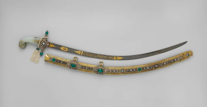 Османский государственный меч, используемый во время церемоний инаугурации султанов. Меч был перекован и украшен в 1876 году нашей эры для запланированной инаугурации османского султана Мурада V (год правления 1876 года нашей эры). Меч состоит из иранского стального лезвия 17-го века нашей эры с рукояткой из индийского нефрита 18-го века нашей эры. Украшен золотыми и позолоченными латунными креплениями XIX века н. э., мастерская работа, усыпанная серебром, нефритом, бриллиантами, изумрудами и жемчугом. Изумруд в верхней части ножен скрывает потайное отделение, в котором находится золотая монета с именем султана Сулеймана Великолепного (годы правления 1520–1566 гг. н. э.). Данный меч находится в коллекции метрополитен-музея, в Нью-Йорке.