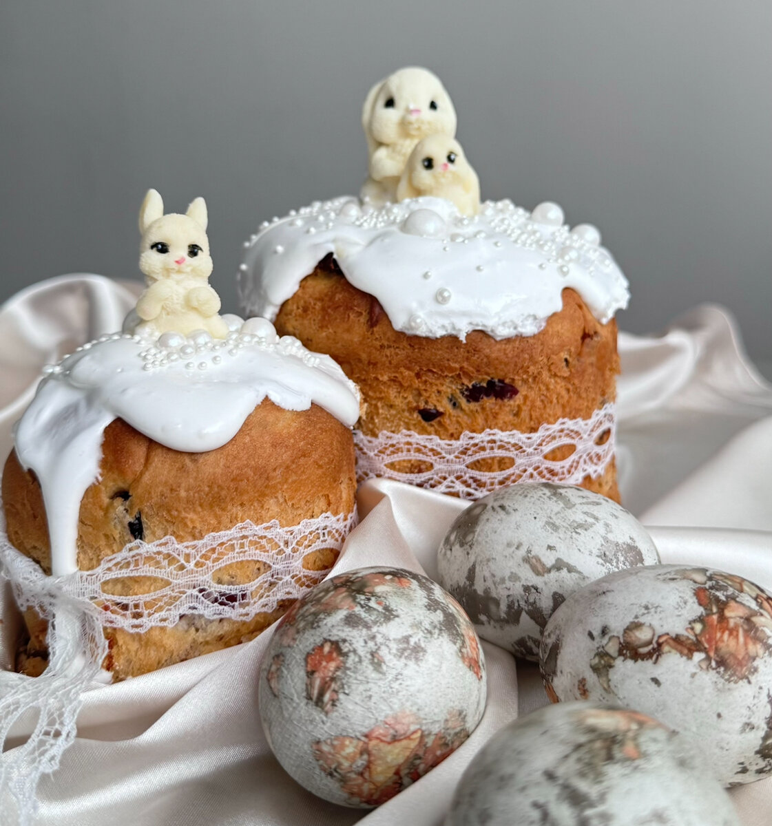 Рецепт Первое делаем опару теплое молоко (300 мл), дрожи сырые ( 20 грамм ), сахар ( 2 ст.ложки) , мука (6 ст. ложек от общей массы 500 грамм). Накрываем, оставляем на 30 минут в тепле пока она не увеличится в два раза. Начинаем делать тесто: в опару добавляем Сахар 200 грамм , ванильный сахар 2 чайные ложки , яичные желтки 6 штук , мука 500 грамм (от общего количества , мы уже взяли 6 ложек) и масло 100 грамм. Замешиваем. Свое тесто разделила на две части, хочу сделать с разными вкусами. Апельсиновую цедру 20 (грамм) в одну часть. Второе тесто с сушенной клубникой ( 15 грамм). Оставляем на два часа. В тесто добавляем изюм, клюкву и цукаты, выкладываем в формы, смазанные маслом - накрываем, оставляем на пару часов, после выпекаем при температуре 180 градусов, первые 15 минут , а потом на 170. Маленькие 20-25 минут , большие 30 минут Украшаем Рецепт крема и глазури Крем для зайчиков. Форма на ВБ за 400 рублей. 50г - сливочного сыра и 30 грамм сахарной пудры соединить -