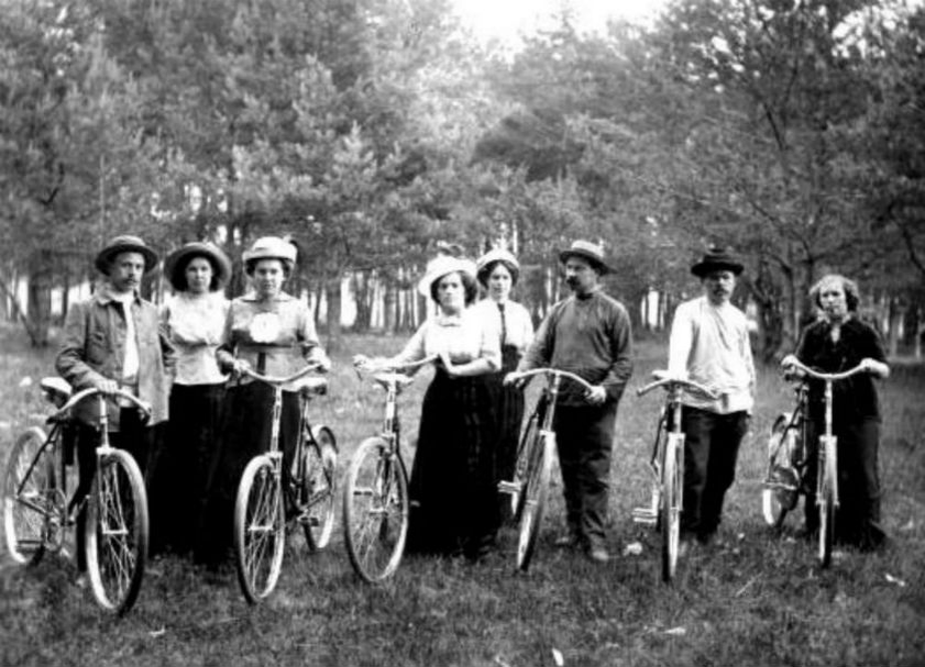 Дамы не желали отставать от мужчин и тоже сели на велосипеды, демонстрируя этим свою независимость. Надо отметить, что в российских городах женская езда на велосипедах официально не была разрешена до второй половины 90-х годов XIX века. Женщина, выехавшая на велосипедную прогулку, пусть и в сопровождении мужчины, рисковала услышать от обывателей в свой адрес массу нелицеприятных эпитетов. Официальное разрешение ездить на велосипеде по улицам городов женщины получили уже в самом конце века.