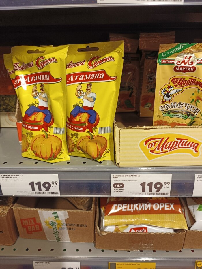 Всем доброго времени суток! Ох и прикипел же у меня опорожняющий отверстий пару месяцев назад, аж решил, что достойно поста на пикабу, только лень было. Я люблю тыквенные семечки, нравятся они мне тем, что можно неторопливо их есть под сериальчик, а они не так быстро кончаются, как семена подсолнечника. Ну и однажды, в пятерочке по акции увидел за 80 р. тыквенные семечки бренда "От атамана", отборные, с солью. Купил, открыл и подумал, что это шутка какая-то... И вот сейчас решил сравнить 2 бренда, не реклама, естественно, просто факты. Пересчитывать количество семечек не буду, я не настолько упоротый, как чел со спичками, поэтому вот: Как видим - цена одинаковая, разница только в граммовке. Открываем обе пачки и... А так? А так? Я пошел дальше и почистил обе семечки. А так? То ли атаманы нынче мелочные пошли, то ли на лоха и так сойдет. Напоминаю, что граммовка у крупных - 100 гр на пачку, у отобранных - 80 гр. У меня один вопрос, производитель семечек "От атамана", вы заявляете, что с