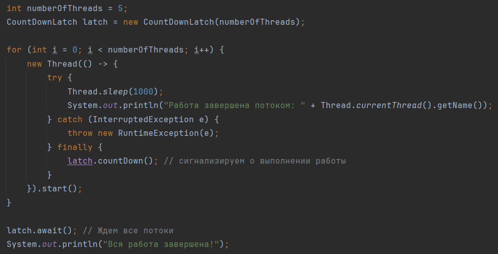 CountDownLatch является частью пакета java.util.concurrent и представляет собой механизм синхронизации, который позволяет одному или нескольким потокам ждать, пока определенное количество других потоков завершат выполнение своих задачи. Это особенно полезно в ситуациях, когда один поток зависит от выполнения нескольких других потоков. При создании экземпляра CountDownLatch необходимо установить начальное значение для счетчика операций. Этот счетчик уменьшается на единицу каждый раз, когда поток завершает работу. В то же время другой поток, ожидающий завершения операций, блокируется до тех пор, пока счетчик не станет равным нулю. После уменьшения счетчика до нуля, CountDownLatch не может быть сброшен или использован повторно. Если вам нужно многократно синхронизировать выполнение потоков, вам может потребоваться создать новый экземпляр CountDownLatch. CountDownLatch является потокобезопасным и может использоваться несколькими потоками одновременно без дополнительной синхронизации. Приме