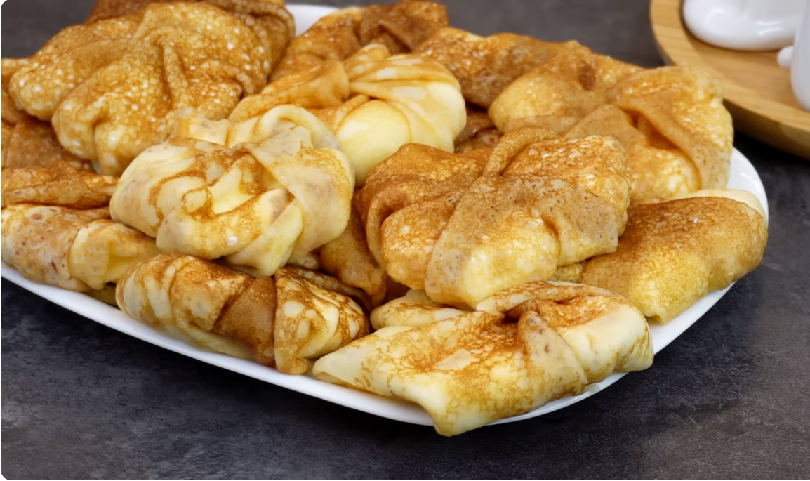 Блины можно испечь по Вашему любимому рецепту, у меня сегодня тонкие блинчики на крахмале.