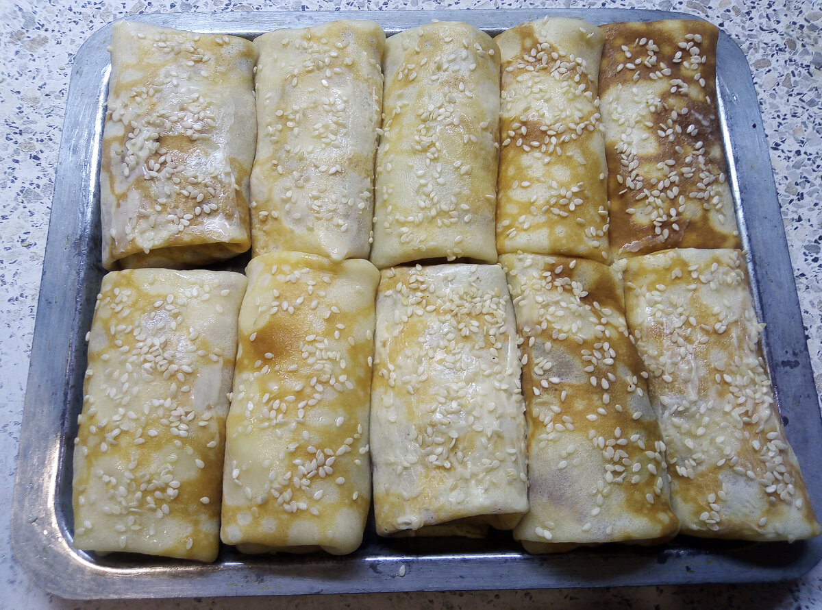Вам понадобится : Тесто блинное: 1 литр молока 0.5 литра кефира 5 яйца 150 грамм сахара 1 чайная ложка соли 1 разрыхлитель Немного ванили 70 грамм постного масла 150 грамм муки ( смотрите на тесто). Хорошо смешайте. убрать на 2-3 часа. потом печь . Фарш № 1 : мясо курицы и лук Фарш № 2 : фарш № 1 / 50% творог. Фарш № 3 : творог, зелень укропа, 50 грамм сок виноградный. Хорошо перемешайте. Испеките блины Ложьте начинку мясную Далее мясо с творогом . Далее можно и с зеленью. Далее с творогом. Заворачиваем как на фото Далее Далее Намажьте маслом сливочным. Посыпьте кунжутом. Сложите на лист Печь 30 минут - 190 градусах. Это очень вкусно Желаю вам приятного аппетита. Просим вас принять участие в голосовании за лучший рецепт. Подпишитесь. Ваш голос важен для нас. Напишите комментарий. Поделитесь рецептом с друзьями и подписчиками в соц сетях.