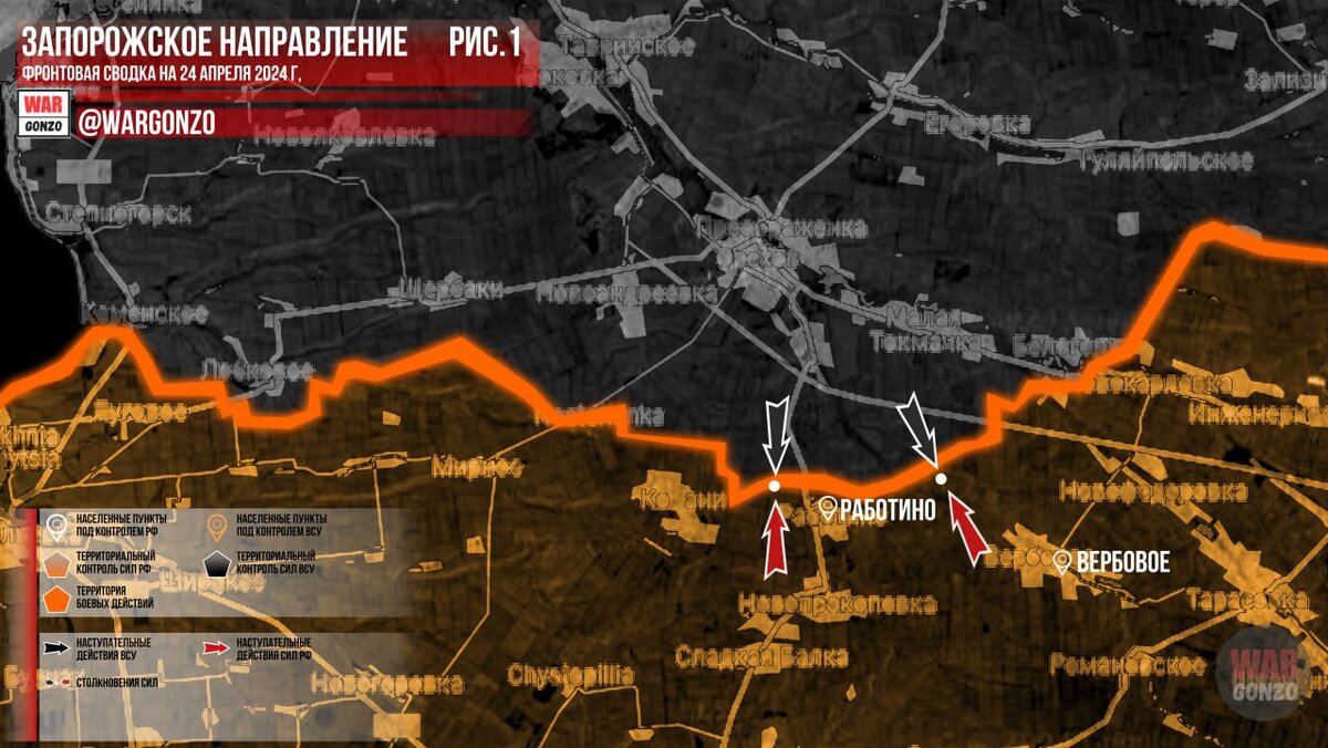 Запорожский фронт. ЛБС без существенных изменений. Активность боевых действий в последние несколько дней значительно снизилась, но назвать направление даже относительно «тихим» все равно нельзя. (Рис. 1) Донецкий фронт. Продолжаются бои на подступах к Парасковиевке. В Красногоровке в результате штурмовых действий, ВС РФ продвинулись в городской черте с юго-восточной стороны. В районе Нетайлово российские войска давят на оборону ВСУ, атакуя украинские позиции. Пока без значительных продвижений. Идут тяжёлые бои. Аналогичная ситуация в районе Уманского, где ВСУ продолжают сдерживать атаки ВС РФ. В районе Семеновки и Бердычей есть тактически успехи ВС РФ, но продвижения в этих населённых пунктах даются российским войскам очень непросто. На данный момент боевые действия разворачиваются на подступах к этим сёлам. Севернее Бердычей есть значительные продвижения в Новобахмутовке. Также инициатива остаётся за ВС РФ и в Очеретино, где ВСУ продолжают отходить все дальше, оставляя свои позиции