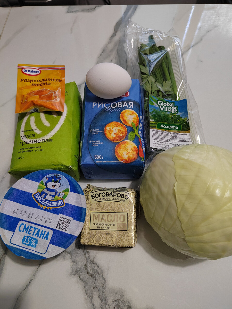 Пирог заливной с капустой, порция 160 гр, 273 ккал, 56 рублей. Состав теста: Мука рисовая 100 гр Мука зеленой гречки 25 гр 1 яйцо 180 гр 15% сметаны (пачка) 50 мл молока (если тесто будет слишком густым) Разрыхлитель чайная ложка без горки Соль Кунжут. Начинка: Капуста 400 гр Зелень 35 гр: укроп, петрушка, зеленый лук, (полупаковки) Растопленное сливочное масло 20 гр Соль Кипяток. Приготовление: Тесто: все ингредиенты смешать, тесто должно получиться, как на оладьи. Дать постоять минут 10. Начинка: капусту нашинковать, посолить, помять, залить кипятком, дать постоять минут 10. Слить воду, хорошенько отжать капусту, добавить мелконарезанную зелень, растопленное масло,соль, специи, какие любите. Хорошо перемешать. На дно формы (у меня 18 см), застеленной пергаментом, залить немного теста, потом разместить всю начинку, вылить остальное тесто. Посыпать кунжутом, поставить в печь на 40-50 мин при 180 градусах. На счет ошпаривания кипятком сырой капусты: если капуста сама по себе мягкая,