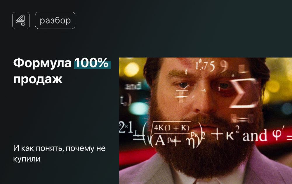 Продажи — это не лотерея. Есть формула продаж, которую используют опытные менеджеры, чтобы закрывать клиентов в продажу без танцев с бубном. Инструкция для повышения продаж уже через 10 минут. Факт продажи зависит от соблюдения некоторых условий. Если все 5 условий, которые я опишу ниже соблюдаются, то сделка состоится 100% Формула П = ФВ × ОП × Д × ЛПР × ЗС ФВ — финансовые возможности клиента купить у вас. Проще говоря: Есть ли у клиенты деньги? Сможет ли он позволить себе ваш продукт? И как бы хорошо вы не предлагали ему продукт, если у него нет на это денег, то он не купит его. ОП — осознанная потребность. Клиент должен понимать, что ему нужен этот продукт, даже не обязательно именно ваш. Д — доверие. Насколько он доверяет лично вам, вашей компании и тд. ЛПР — лицо принимающее решение. Если вы общаетесь не с тем человеком, то и устанавливаете доверие не с тем лицом и тд. В этом случае у вас не купят или же процесс согласования будет очень долгий. ЗС — здесь и сейчас. Клиент должен п