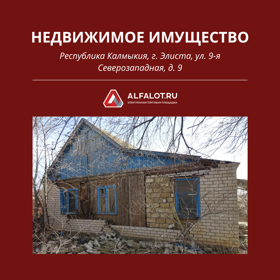Продается одноэтажное жилое здание на земельном участке (площадь участка - 660 кв.м) Местонахождение здания - Республика Калмыкия, г . Элиста, ул. 9-я Северозападная, д . 9 Материал здания - кирпич Все коммуникации центральные, газоснабжение - автономное. Состояние здание - нормальное. ТОРГИ: ССЫЛКА НА ТОРГИ