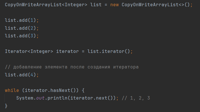 CopyOnWriteArrayList является частью пакета java.util.concurrent, предоставляющего возможности для многопоточного программирования в Java. Этот класс был введен в Java 5. CopyOnWriteArrayList обеспечивает потокобезопасность для операций чтения данных. Главной особенностью CopyOnWriteArrayList является то, что он копирует свое содержимое каждый раз, когда происходит изменение. Это означает, что при каждой операции добавления, удаления или изменения элемента создается копия внутреннего массива данных. Это делает его идеальным выбором в ситуациях, когда операции чтения гораздо более частые, чем операции изменения. Преимущества Ограничения Пример использования Обратите внимание, что в этом примере мы добавляем элемент после создания итератора, но в самом итераторе этот элемент отсутствует. Это происходит потому что при добавлении создается новый массив, а итератор работает со старой копией. Заключение CopyOnWriteArrayList представляет собой мощный инструмент для обеспечения потокобезопасно