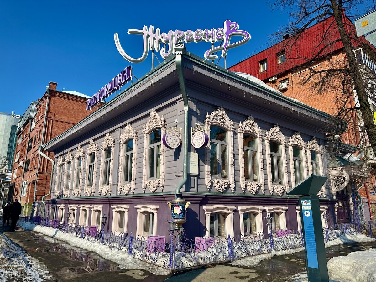 Помните фразу почтальона Печкина? Иван Федорович Крузенштерн – человек и пароход? В Тюмени мы встретили ресторан, названный в честь не менее известного человека, Ивана Сергеевича Тургенева. Ещё одно аутентичное едальное заведение Тюмени – ресторан «Тургенев» - также расположено в бывшем купеческом особняке города, который изначально принадлежал купцам Чираловым. Сергей Степанович Чиралов был кожевенным магнатом, известным за пределами Сибири. У него были две дочери с необычными именами – Виринея и Филанида. Особняк унаследовала Филанида, а вот его кожевенное дело продолжить она не смогла. Кстати, Виринея с супругом построили особняк рядом, он тоже сохранился и выглядит очень эффектно. Но вернемся к ресторану «Тургенев». Уже издалека он бросается в глаза рядом больших окон с ажурными кружевными коронами, похожими на кокошники. Снизу наличники напоминают цветок – такое ощущение, что такие украшения на фасаде появились не просто так, а из-за того, что в доме жили исключительно дочки. Вн