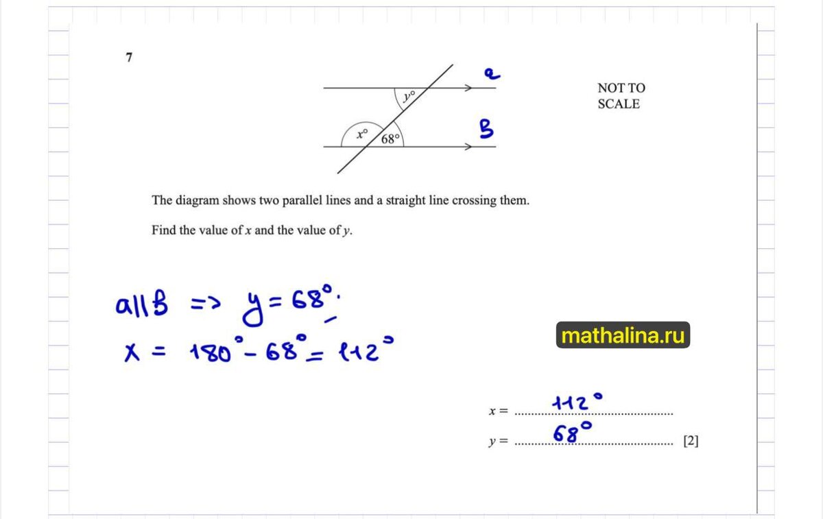 Здравствуйте! Сегодня рассмотрим несколько задач по геометрии из Cambridge IGCSE. Перед разбором решений хочу уточнить, что сдающие могут пользоваться калькулятором при подсчетах, поэтому применение всяких так теорем косинусов с нетабличными значениями вполне допустимы и ожидаемы. NOT TO SCALE - не масштаб. то есть рисунок сделан примерный, не нужно пытаться решить с помощью линейки)) Все доп.обозначения сделаны синим и другими цветами. №7. The diagram shows two parallel lines and a straight line crossing them. Find the value of x and the value of y. Переведем: На диаграмме показаны две параллельные прямые и прямая, пересекающая их.