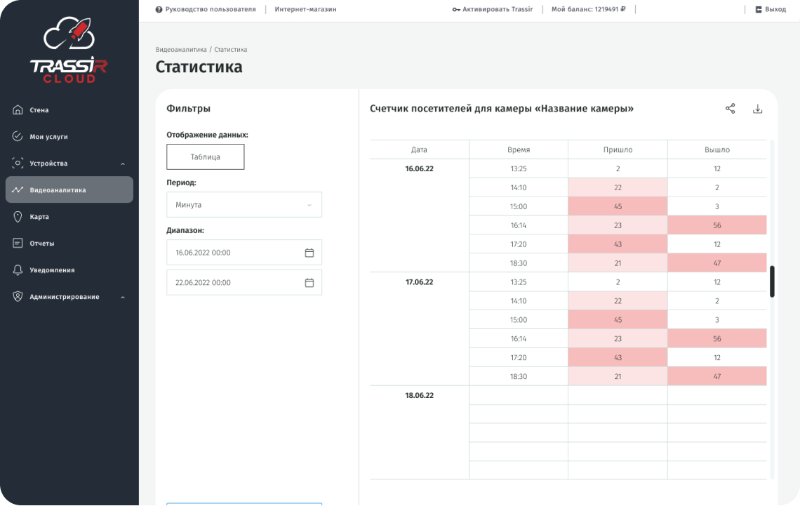 На нашем сайте вы найдете инструкцию по подключению, а также подробную информацию. Переходите на официальный сайт TRASSIR Cloud чтобы подключить услугу «Счетчик посетителей».