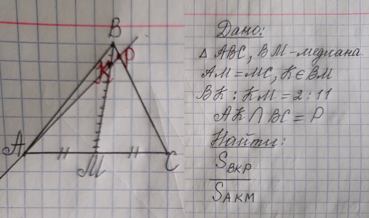 В треугольнике АВС на его медиане ВМ отмечена точка К так, что ВК:КМ=2:11. Прямая АК пересекает сторону ВС в точке Р. Найдите отношение площади треугольника ВКР к площади треугольника АКМ. Решение. Рассмотрим треугольники ВКР и АКМ. В них углы ВКР и АКМ равны как вертикальные. По теореме об отношении площадей треугольников, имеющих по одному равному углу, справедливо равенство: Отношение ВК к КМ равно 2 к 11 по условию, осталось найти отношение КР к АК. Для этого нам не хватает данных задачи. Введем дополнительное построение. Проведем прямую МЕ||АР👇 Если треугольники подобны, то их сходственные стороны пропорциональны👇ВК:ВМ=КР:МЕ=ВР:ВЕ По условию ВК:КМ=2:11, значит ВК:ВМ(11+2) =2:13. Вывод. Коэффициент пропорциональности сходственных сторон равен 2:13 👇 ВК:ВМ=КР:МЕ=ВР:ВЕ=2:13 Выпишем нужное нам отношение: КР:МЕ=2:13. Выразим отсюда КР: КР=2/13МЕ Осталось выразить АК через МЕ и отношение площадей треугольников ВКР и АКМ будет найдено. Итак, АК=24/13 МЕ, а КР=2/13МЕ Подставим