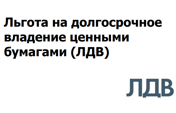 Льгота долгосрочного владения (ЛДВ) - это возможность не уплачивать налог на прибыли от продажи активов, которыми вы владеете более 3 лет. Суперподробную презентацию от Мосбиржи можно посмотреть тут А если кратенько, то Условия: Несколько примеров, чтобы понять как считается база: Пример 1. Вы купили 10000 Акций А за 100 рублей и продали их через 3 года за 300 рублей. Ваша прибыль= 10000х300 - 10000х100= 2 000 000 рублей. База для налогового вычета 3 года х 3 000 000 рублей = 9 000 000 рублей. Как итог, Вы налог с прибыли не платите Пример 2. Вы купили 10000 Акций А за 100 рублей в 2020 году, и 10000 Акций Б за 200 рублей в 2021 году. Все продали в 2024 году за 200 и 400 рублей, соответственно. Налоговая база считается тогда так: сначала надо посчитать коэффициент владения акциями: (прибыль А х срок владения А + Прибыль Б х срок владения Б) / ( Прибыль А+ Прибыль Б) = (1000000 х 4 + 2000000 х 3)/(1000000+200000) = 3,33. Далее, этот коэффициент подставляем в формулу определения вычет