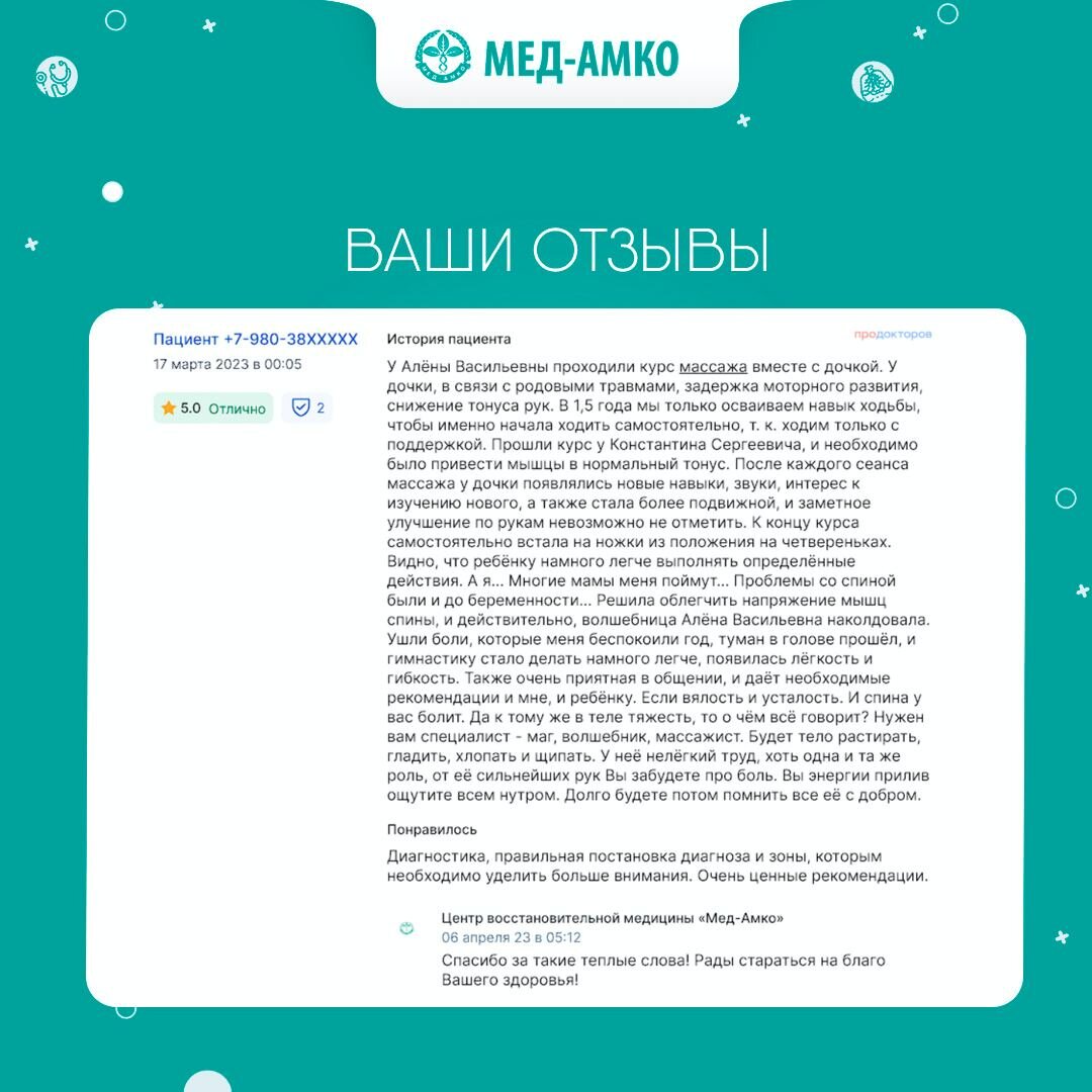 Мы глубоко признательны всей вашей семье за выбор наших услуг. Для нас большая честь быть вашими союзниками в поддержании здоровья. Ваше доверие – наша главная награда ❤️ Благодарим за ваш отзыв и обещаем продолжать предоставлять высококачественное медицинское обслуживание с заботой о вашем благополучии! До встречи на пути к здоровью и благополучию! Ваш медицинский центр «Мед-Амко»