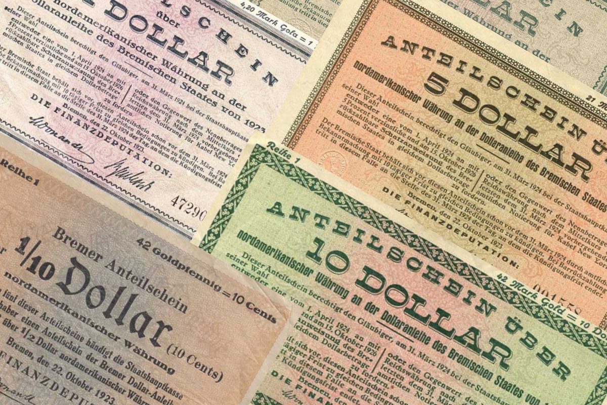 Когда во время гиперинфляции 1923 года немецкая марка рухнула, многим муниципалитетам пришлось искать творческие решения для финансирования своих инфраструктурных мероприятий, а также для создания стабильных по стоимости чрезвычайных фондов. В то время финансовым новшеством, порождённым необходимостью, были "облигации с фиксированной стоимостью", которые к концу 1923 года всё чаще выпускались в обращение – часто секьюритизированные в форме паёв – на основе золота, долларов, ржи, пшеницы, угля и т. д В октябре 1923 года Сенат штата Бремен принял решение о выпуске долларовых облигаций, разделённых на акции общей стоимостью один миллион долларов в североамериканской валюте (= 4,2 миллиона марок золотом). Векселя были бумагами на предъявителя и использовались, в частности, для ежедневных покупок без необходимости оплачивать их кучей бумажных марок, которые становились всё более бесполезными каждый день. Для обеспечения долларовых облигаций или их паёв Бременское государство взяло на себя о
