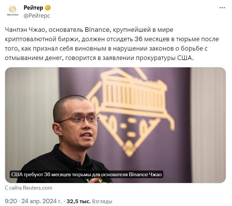 Основателю Binance Чанпэн Чжао CZ грозит 3 года тюремного заключения после того, как он признал себя виновным в нарушении законов об отмывании денег. 🗣По информации Reuters, американские прокуроры в окружном суде западного округа Вашингтона заявили: «Учитывая масштабы умышленного нарушения CZ законодательства США и его последствий, оправдано наказание в виде лишения свободы на срок в 36 месяцев». 📆Приговор будет вынесен 30 апреля и кроме потенциальных 3 лет тюрьмы, CZ грозит штраф в размере $50 млн, хотя до этого срок составлял 18 месяцев. 👉B2BTrade👈