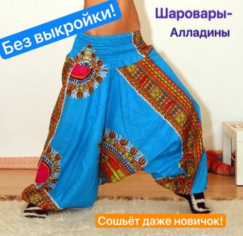 Молодежь полюбила удобные и свободные шаровары-алладины. Также, часто используют их, как элемент костюма для восточных танцев или восточных единоборств. А сшить их совсем просто! Попробуйте: Шитье шаровар займет не более получаса, а выкройки и вовсе не понадобится.
