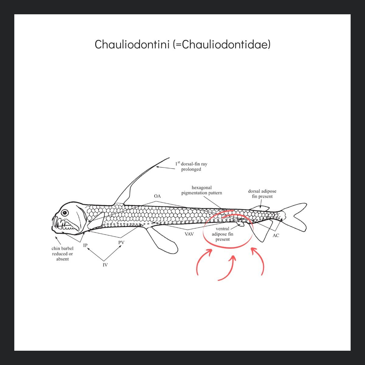 Сегодня я хочу поделиться с вами фактом, ставшим для меня недавно совершенным откровением. Возможно, об этом все знают, и только я каким-то образом умудрился упустить это, но, оказывается, жировой плавник, характерный для представителей целого ряда групп рыб, в том числе лососей, харациновых и многих сомообразных, может быть расположен не только дорсально на хвостовом стебле, но и вентрально! Вентрально, Карл!!! Интересно, что даже в словарях и энциклопедиях в описании жирового плавника его положение четко определено как «сзади от спинного плавника» или «между спинным и хвостовым плавниками». Про возможность его вентрального положения я узнал случайно, обратив внимание на схему строения рыб из группы Chauliodontini семейства Stomiidae, где он даже специально подписан как «ventral adipose fin». Источник (это была книга из серии FAO Species Identification Guide) вызывал доверие, а описание группы в «Fishes of the World» Нельсона окончательно развеяло сомнения - такое, и правда, бывает! Б