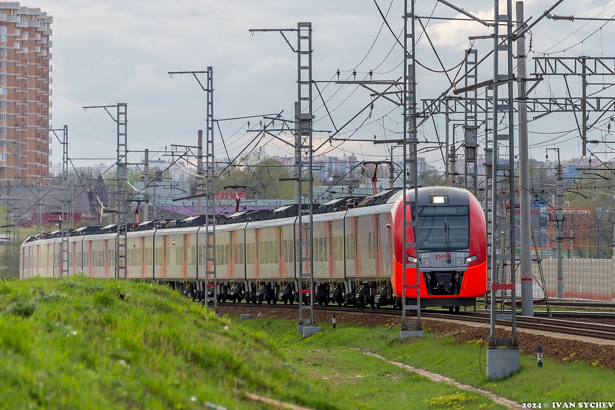 Да, пожалуй, этот будет претендовать на то, чтобы быть самым нудным: здесь традиционное место неподалеку от о.п. Кучино (как я выкрутился, чтобы не писать осточертевшее всем Ольгино?), да и набор подвижного состава вполне себе стандартен для буднего дня этого участка Горьковского направления Московской железной дороги. Хотя и тут можно поискать любопытности… Ну что, попробуем вместе? 1-3. Начнем с самой обычной «Ласточки»… Хотя стоп, во-первых она десятивагонная. Во-вторых, она следует рейсом в Нижний Новгород, и ее путь – скоростной. Должен быть. Но конкретно здесь она идет по пути, предназначенным для поездов четвертого диаметра. Ну и чисто для статистики: перед нами ЭС1П-035 со всех, если так можно сказать, ракурсов. 4-5. И не успела «Ласточка» поравняться с платформой Ольгино (эх, ну куды бечь, приходится писать надоевшее название), как навстречу выскочил «монстрик», причем, наверное, самый любопытный сейчас на Горьковке. Все потому что один головной вагон у него числится как ЭД4МК
