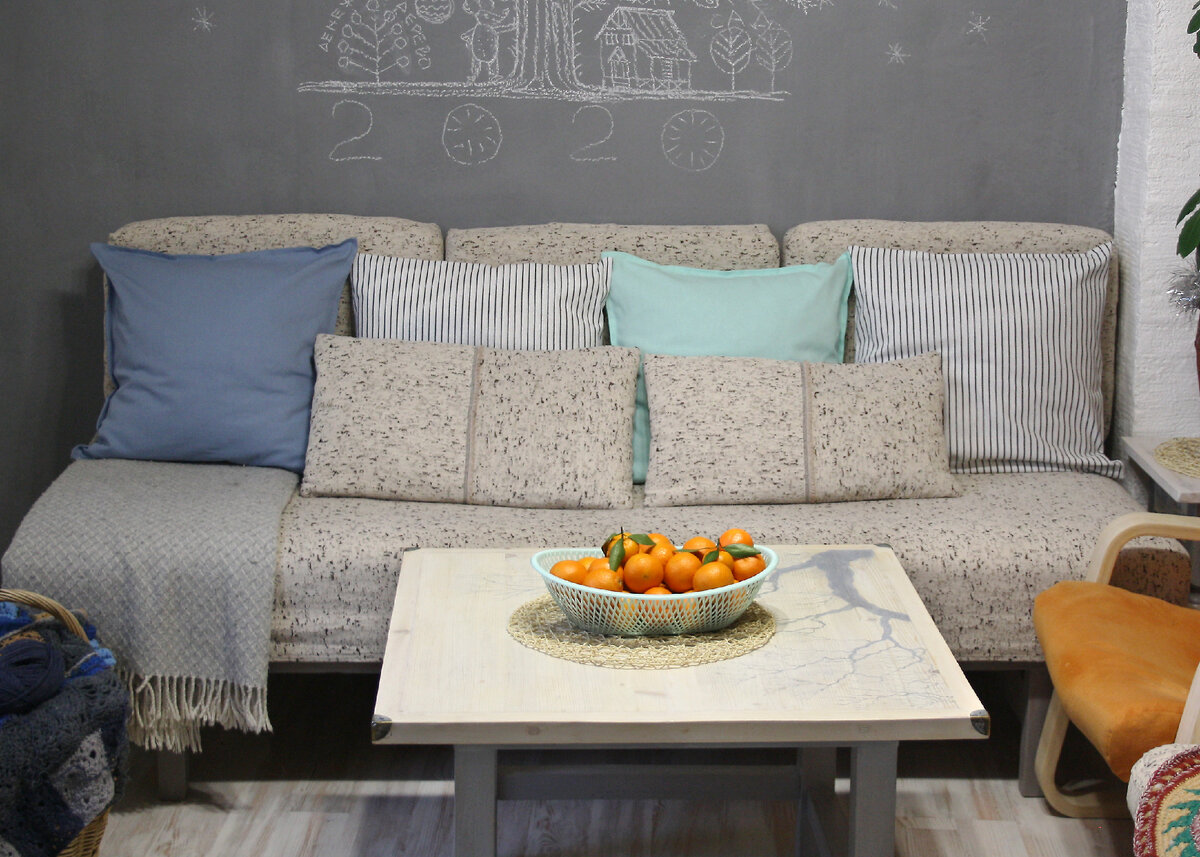 Наверное было огромное количество переделок этого столика. Не осталась в стороне и я. Маловат он был для нас, любили мы покушать на нём, сидя на диване. Но все началось спонтанно, как многое из моих переделок, с двух кусков мебельного щита, оставшихся от ремонта. Склеила их между собой (шканты и ПВА). Для солидности решила добавить толщины новой столешнице. Напилила из бруска 30*30 рамку и на клей и саморезы прикрепила бруски к торцу. Шляпки саморезов утопила и прикрыла остатками шкантов. Конечно все отшлифовала машинкой. Щиты и брусок были уже строганные из магазина, поэтому взяла зерно 120 и 180. Затем добавила брутальности корпусу, сделав перекладины для ног. Просто прикрутила бруски 40*40 саморезами к ножкам стола и закрыла шляпки мебельными заглушками. Выкрасила корпус в серый с небольшими ухищрениями с состариванием сухой кистью более темным оттенком. К тому же надо было слегка сымитировать волокна древесины на картонных ногах Лакка. Осталось только собрать все детали воедино.