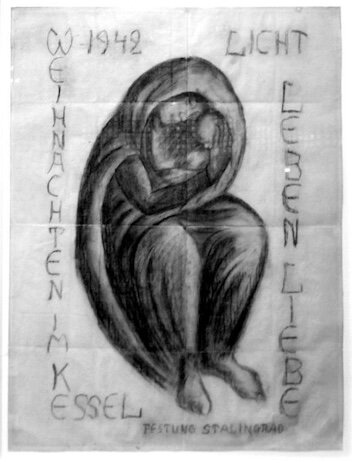 Вокруг фигур надпись крупными буквами на немецком языке: «Licht Leben Liebe Weihnachten im Kessel 1942», что переводится как "Свет Жизнь Любовь Рождество в котле 1942". Внизу рисунка написано еще два слова: "Festung Stalingrad"