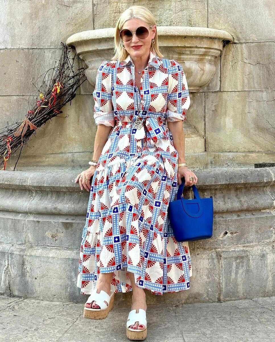 Выбранный сарафан модница Петра дополнила ярко-синей сумкой без декора и летними белыми босоножками на платформе. Завершили ее образ идеально подобранные аксессуары - круглые солнцезащитные очки, подвеска на шее в области декольте и браслеты на обеих руках.