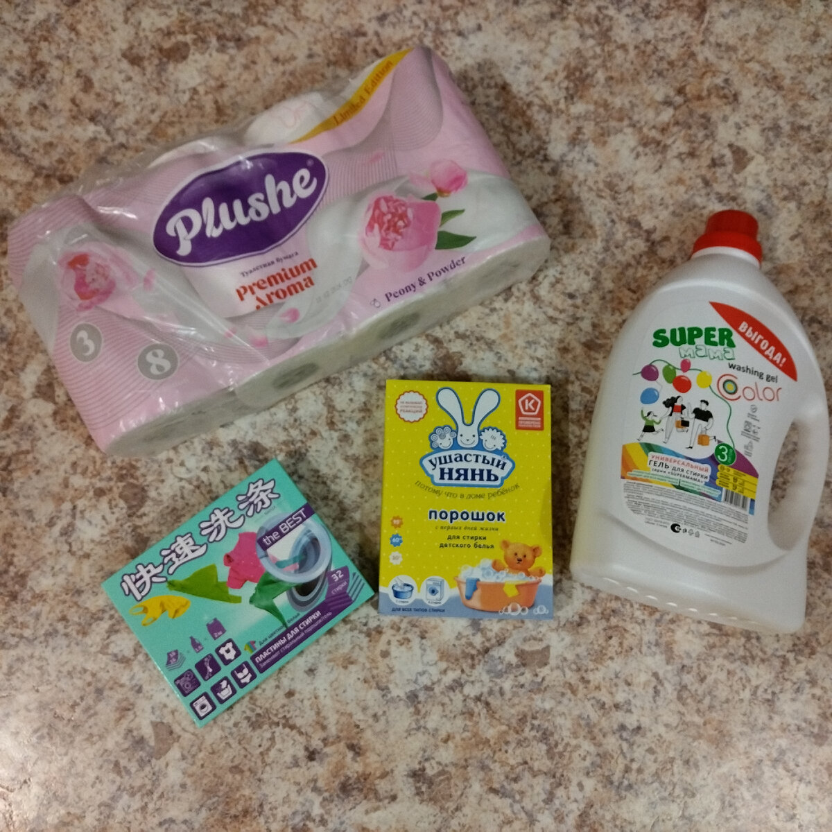 Всем привет! Сегодня делюсь покупками из магазина Fix Price. Есть товары которые я покупаю только в этом магазине, за бытовую химию и расходники я не готова переплачивать. Зачем платить больше если есть замена товарам ничуть не меньшего качества. 1. Туалетная бумага Plushe – качество суппер! 3 слоя 8 рулонов. Цена 149 рублей! Хватает такой упаковки надолго и приятный цветочный аромат чувствуется через упаковку. 2. Стиральный порошок в пластинах (листах) – взяла первый раз. Мне очень понравился такой формат. Расход – 1 лист на 1 стирку. Отстирывает не хуже порошка. Растворяется лист мнгновенно. Пены не много, запах стандартный порошок не задерживается в белье. Одна коробка – 32 стирки. 3. Гель для стирки универсальный Супер Мама – обьем 3 ЛИТРА! Гель отлично отстирывает, густой, малый расход и отличный запах. Стоимость такой находки 245 рублей! Такого объёма хватает больше чем на месяц при интенсивных стирках. Очень удобная крышка колпачок. 4. Гипоаллергенный порошок Ушасты