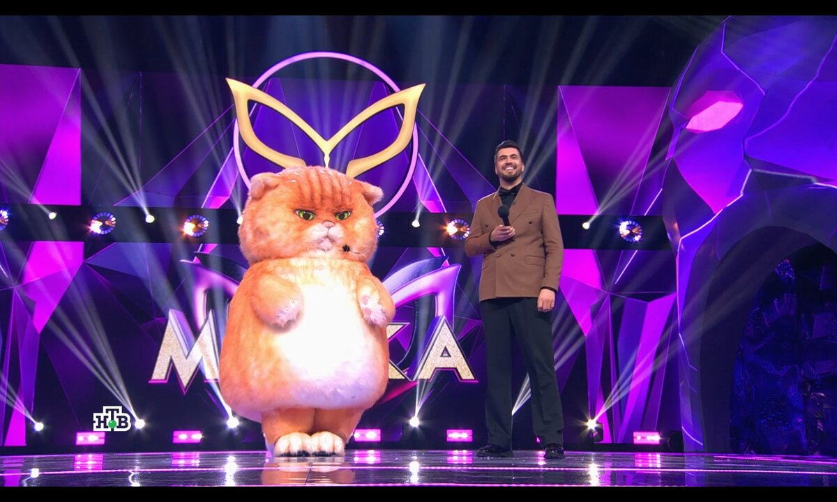 Первая маска Кот пушистик "Носорог пригласишь меня в ресторан, ты любишь мышиное канапэ?" - Я люблю мышиное карпачо))) Котик Кошечка поющая очень. Кирилл думает Ани Лорак, Киркоров против категорически, там Стоцкая, а Родригез с Валерией уверены, что там Алиса Мон. Там целый график выстроился по походу в ресторан с Котиком))
