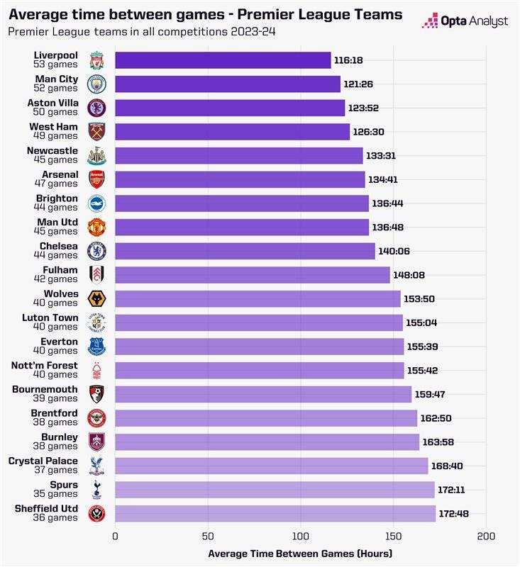 В Англии не зря жалуются на плотный график. Клубы из АПЛ отдыхают меньше, чем остальные команды из топ-5 Европы