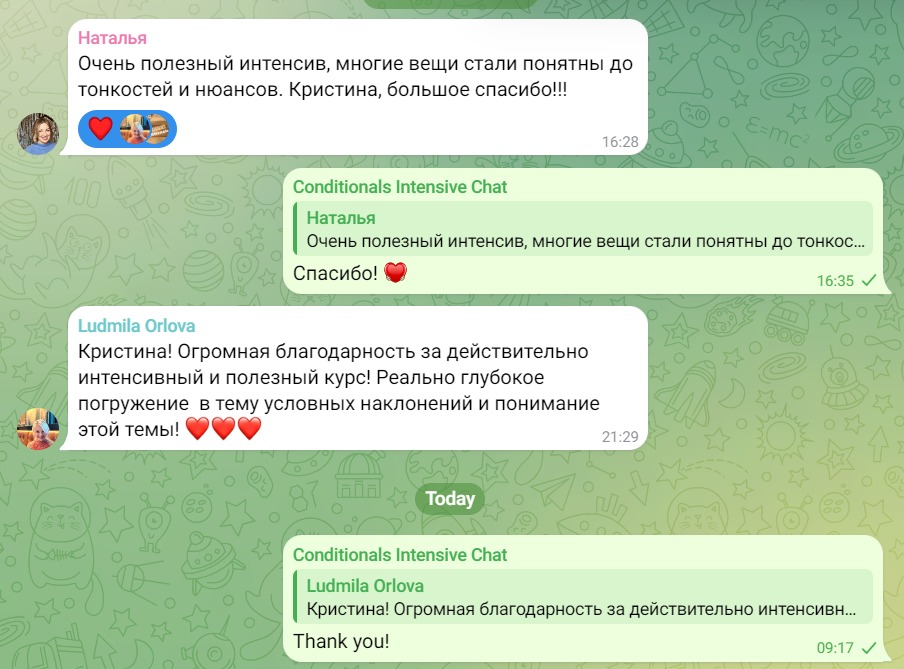 Hey guys! We have finished our conditionals intensive! In only you were with us, you could enjoy it enormously! Дорогие друзья! Мы закончили наш интенсив по условному наклонению! И теперь все, кто его прошли, с легкостью могут объяснить построение предложения тремя строчками выше. Если вы тоже хотите устранить пробелы в понимании условного наклонения в английском языке – у вас всё ещё есть такой шанс! Доступ к каналу со всеми размещенными материалами, объяснениями, упражнениями и их анализом будет открыт до 21 мая! Приобретайте доступ по этой ссылке (2000 рублей) и присоединяйтесь к тем, для кого условное наклонение стало супер понятным. *** Сайт преподавателя Телеграм-канал