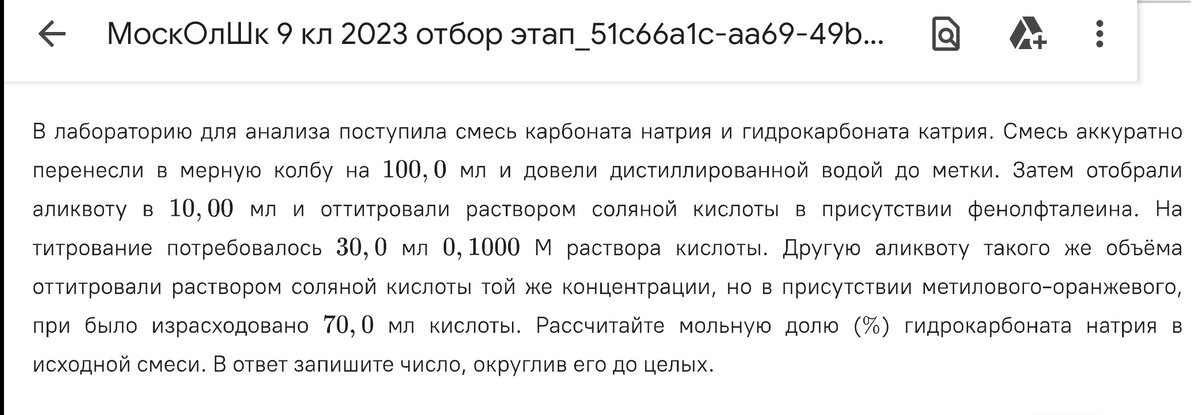 Кислотно-основное титрование давно и прочно прописалось во многих химических олимпиадах школьников. Причём, не только в практических турах, но и в теоретических встречаются задачи, условия которых построены на титровании. Суть кислотно-основного титрования хорошо изложена Т.Г.Белоусовой: Вот отличный мастер-класс по кислотно-основному титрованию: А я предлагаю разобраться вот с этой интересной задачей про смесь: 1. Оттитровать кислотой можно не только раствор щёлочи, но и ту щёлочь, которая возникла в растворе в результате гидролиза. В данном случае гидролизован карбонат натрия, причём количественно: Na₂CO₃ + HOH = NaOH + NaHCO₃ И первая аликвота с фенолфталеином требует для нейтрализации 0,03 л * 0,01 моль экв/л = 0,003 моль эквивалентов соляной кислоты. Реакция идёт по уравнению: NaOH + HCl = NaCl + H2O Значит, согласно Закону эквивалентов, столько же моль экв NaOH содержится в аликвоте 10 мл. А в 100 мл раствора их содержится 0,03 моль экв. Это соответствует 0,03 моль эквиваленто