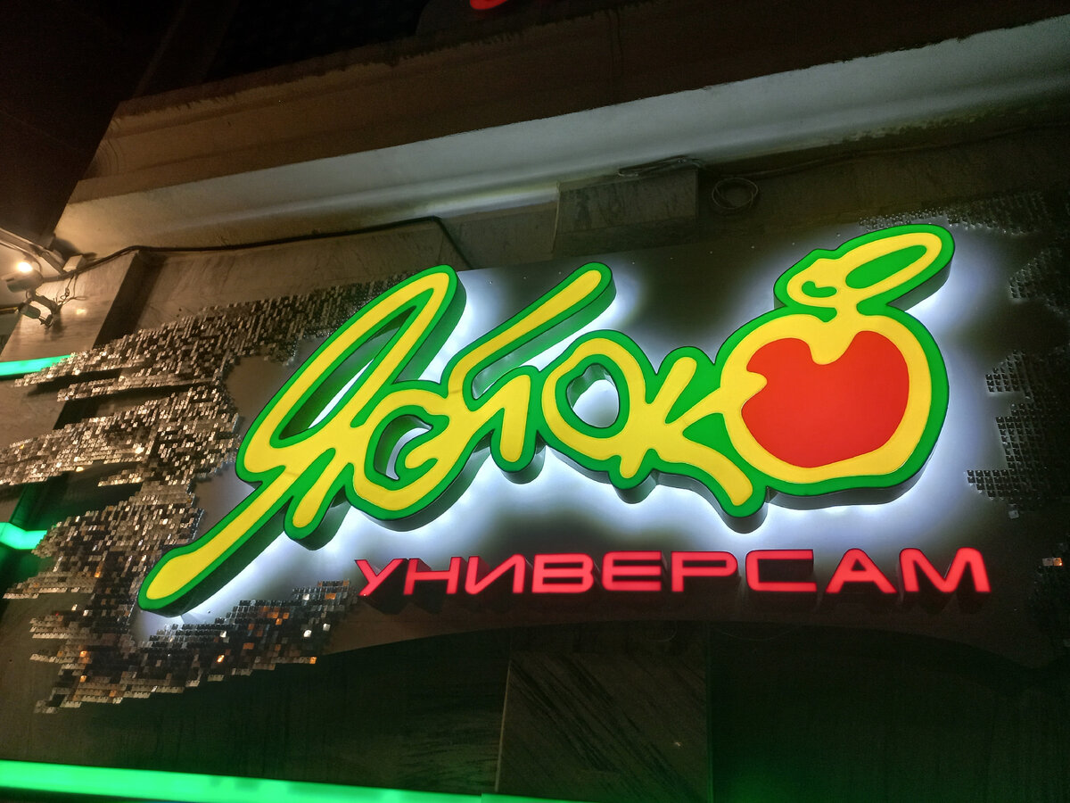 Следующей ступенькой (примерный аналог – «Перекресток») я счел бы сеть крымских супермаркетов «Яблоко». Логотип супермаркета на заглавном фото.