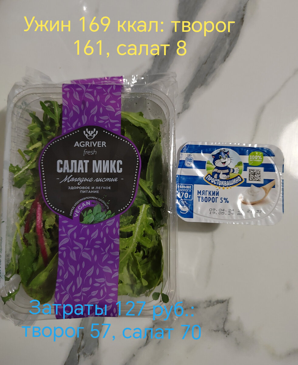 Сегодня малокалорийный ужин, потому что обед был слишком сытным. Ужин: творог мягкий 5% 180 гр, салат листовой микс 35 гр. На фото сверху калорийность, снизу стоимость блюда.