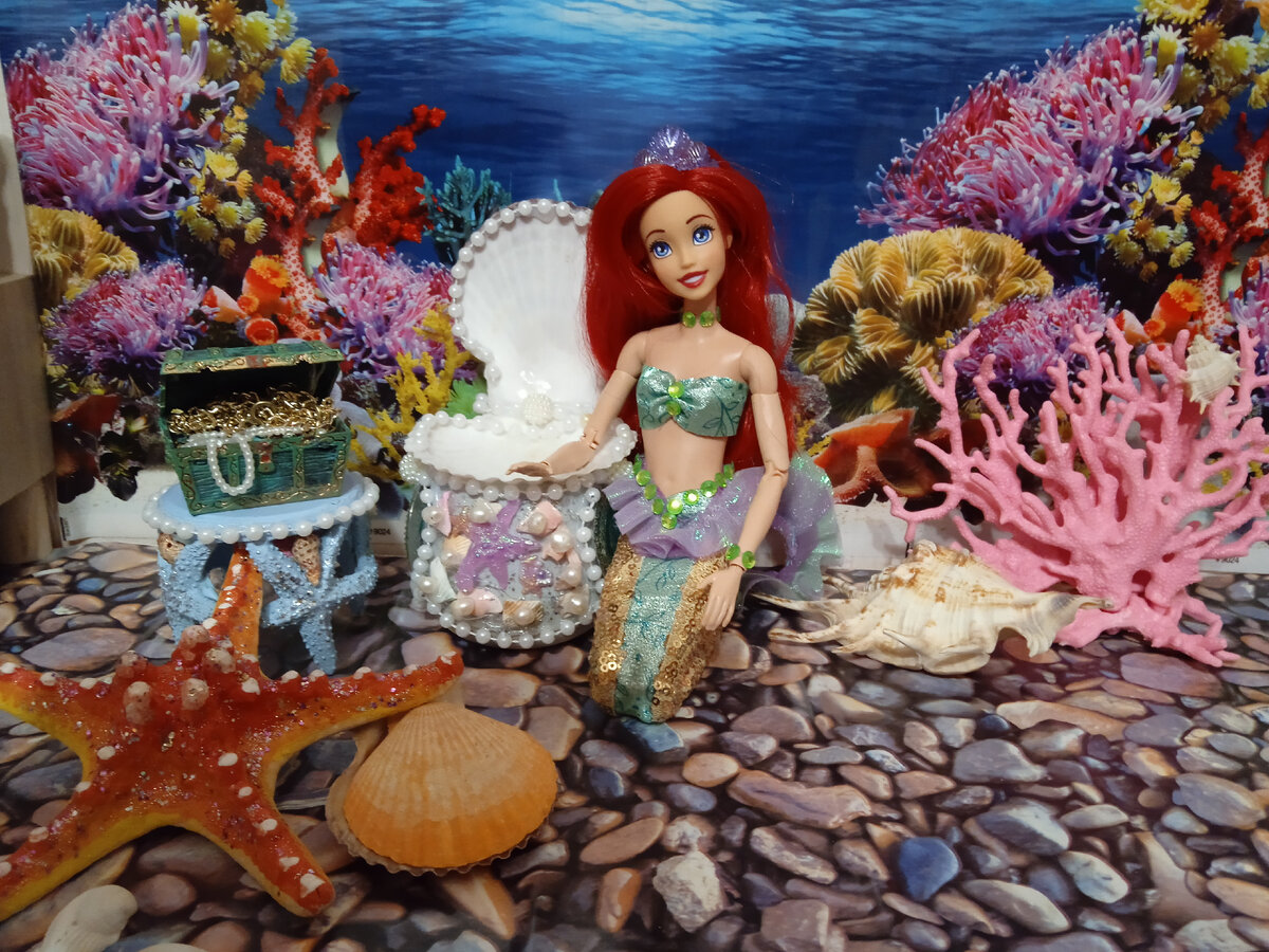 Сегодня наконец, я покажу вам, где живет моя любимица жительница морей и океанов. Долго я прятала её от ваших глаз. Сперва искала для неё шарнирное тело, потом искала ткань для хвостика и топа. И очень долго продумывала оформление и аксессуары её подводного дома: фон, ракушки, кораллы, её друзья - обитатели моря, сундучки, камушки... Делала для неё столик из подсвечника и кресло из ракушек (об этом вы можете прочитать в предыдущей статье). И вот наконец она приплыла посмотреть свой дом. Посмотрите и вы. Ей очень понравился стульчик из ракушек - её кресло принцессы, маленький столик и сундучок с украшениями. А как же без друзей? Конечно её близкие друзья дельфин Вик и малыш касатка Блэк приплыли к ней в гости. И конечно её любимец китенок Блэк. Вот такая русалочка со своим подводным миром у меня теперь живёт. Её дом стал для неё уютным и красивым! Думаю ей понравилось! А понравился ли вам тот мир, в котором теперь обитает моя русалочка? А может у вас есть такая же или ей подобная куко