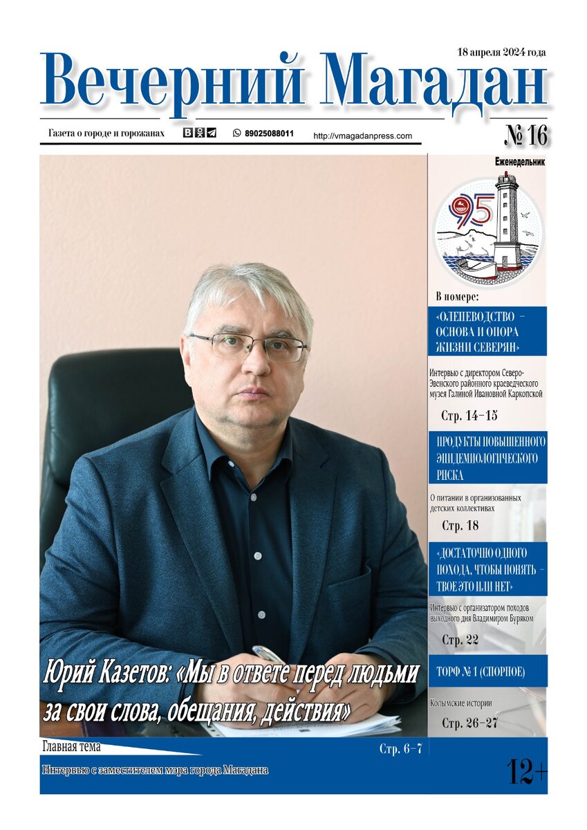 Свежий номер «Вечернего Магадана» от 18.04.2024 года получился информативным, интересным и полезным. ✍️ «Главное в моей работе – это уважение людей» – интервью главного редактора «ВМ» Натальи Мифтахутдиновой с заместителем мэра города Магадана Юрием Казетовым. Ответственность перед людьми, желание помочь – гостю нашего интервью это знакомо не понаслышке. Он отработал в органах местного самоуправления 25 лет, и как строить диалог с населением, чтобы он был конструктивным, а итог удовлетворял обе стороны, Юрий Михайлович за эти годы научился. В интервью «ВМ» он рассказал о том, что сегодня находится под его кураторством, какой из реализованных проектов является для него самым значимым, тяжело ли быть заместителем мэра, в чем плюсы данной работы, а также чем чиновники отличаются от людей рядовых профессий. 🦌 «Оленеводство – основа и опора жизни северян» – интервью ведущих подкаста «Ваши уши» Дмитрия Андреева и Арсения Гарипова с директором Северо-Эвенского районного краеведческого м