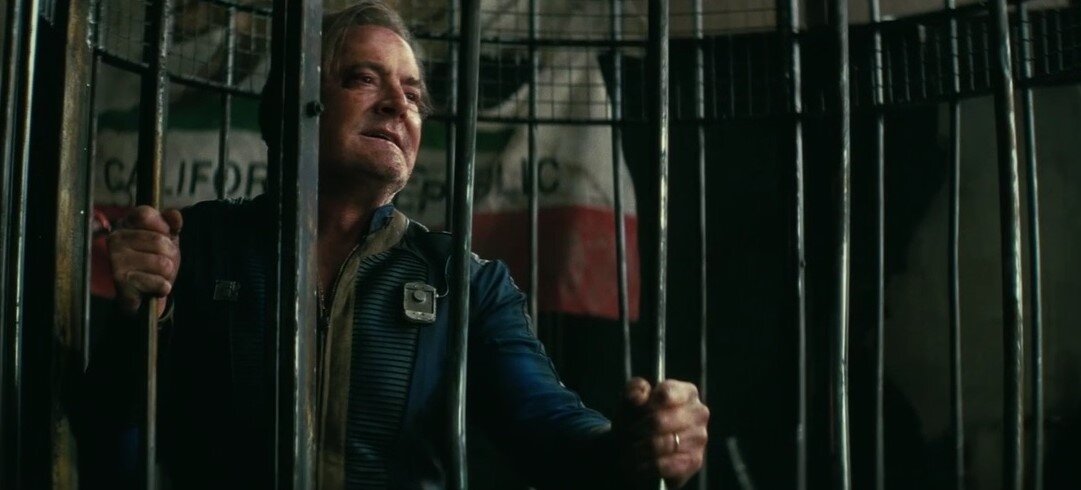 Люси пришла в резиденцию Ли Молдейвер. Странная женщина, странная – это я про Ли, оказывается, она теперь лидерша Новой Калифорнийской Республики. Как она сохранилась за 200 с лишним лет, нам рассказать не удосужились. Сидит Ли за столиком, кушает с аппетитом, и тут же за этим столом, привязан к стульчику даже не гуль какой-то, а нечто похожее на зомби. Помятый папка Люси мается тут же в клетке.